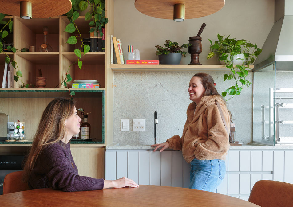 Para atender à paixão do morador por cozinhar, criamos uma cozinha funcional e convidativa: bancada generosa, cuba dupla, torre de tomadas retrátil e soluções inteligentes de organização.