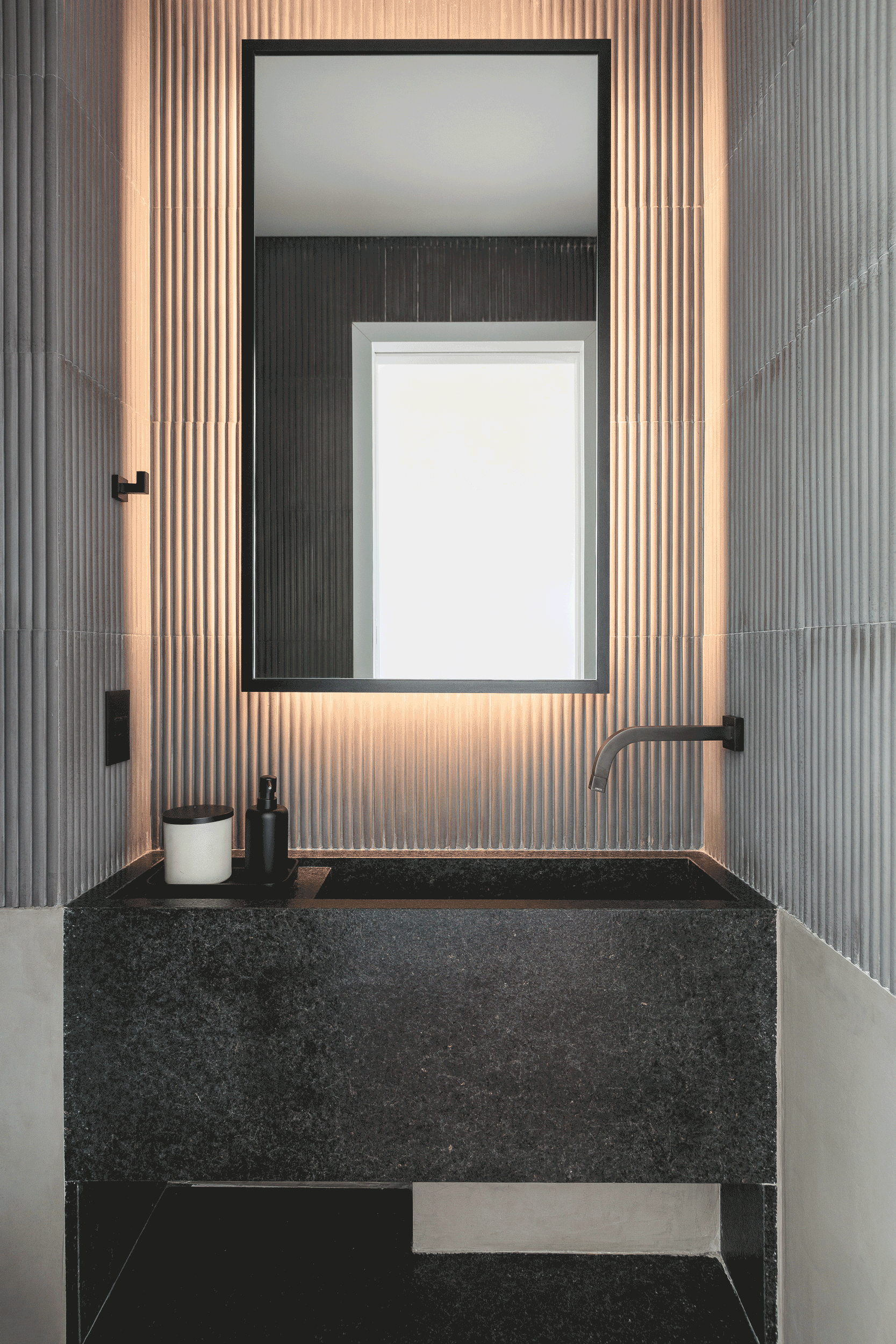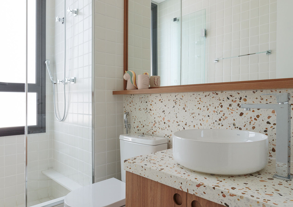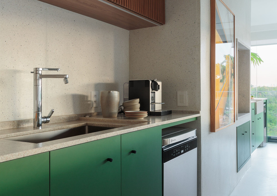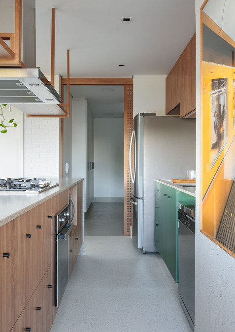 A alteração de paredes e ambientes da área social foi drástica, já que eles queriam uma grande área social com tudo integrado e sem divisões. Inclusive, a ideia era que a cozinha abrigasse também a parte da parrilha, sonho do morador, e que tudo fosse um único espaço junto com a sala e o escritório. Os espaços também precisavam abrigar a coleção de toy art do casal, além de diversas outras peças de decoração importantes para eles.
