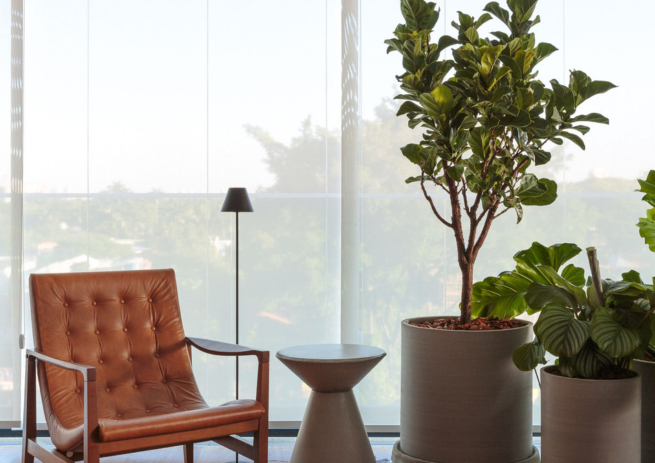 Com isso, criamos uma enorme ilha que abriga funções da cozinha, do gourmet e da sala, com uma prateleira suspensa para parte da décor, plantas e utensílios. A parte da sala recebeu estante metálica para abrigar a coleção, e o escritório ganhou local privilegiado, com vista para a copa das árvores e muito verde do paisagismo interno em volta.